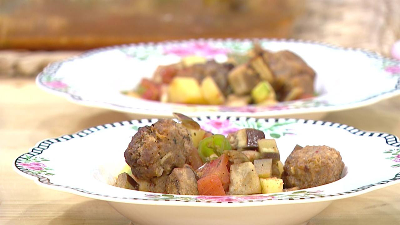 Kabağın, patatesin, domatesin kabuklarını soyun. Patlıcanı alaca soyun. Hepsini kuşbaşı doğrayın. Arpacık soğanın ve sarımsakların kabuğunu soyup bütün bırakın. Sivri biberleri 1’er cm aralıklarla doğrayın. Doğradığınız sebzeleri büyükçe bir kaba alın. Nane, kekik, kırmızı pul biber, tuz ve karabiberle baharatlandırın. Zeytinyağını ekleyip karıştırın. Sebzeler suyunu biraz salana kadar bekletin.