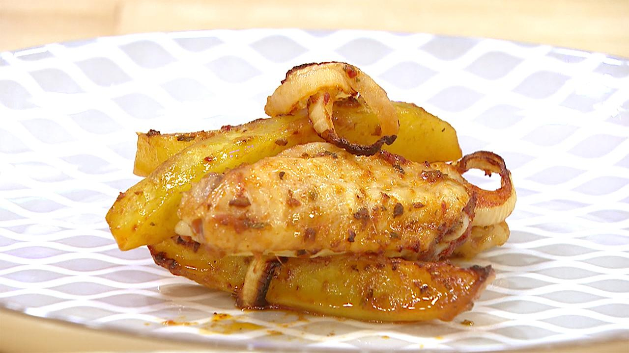 Patatesler elma dilim şeklinde doğranır. Tavuk ve patates birlikte karıştırılıp tepsiye yayılır.