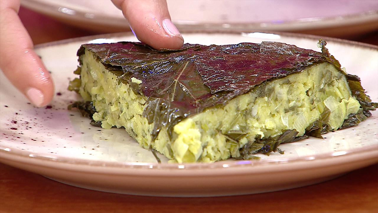 Asma yapraklarını, damarlı kısımları üstte kalacak şekilde ve tavanın kenarlarından hafifçe sarkacak şekilde tüm tavanın zeminine yerleştirin.