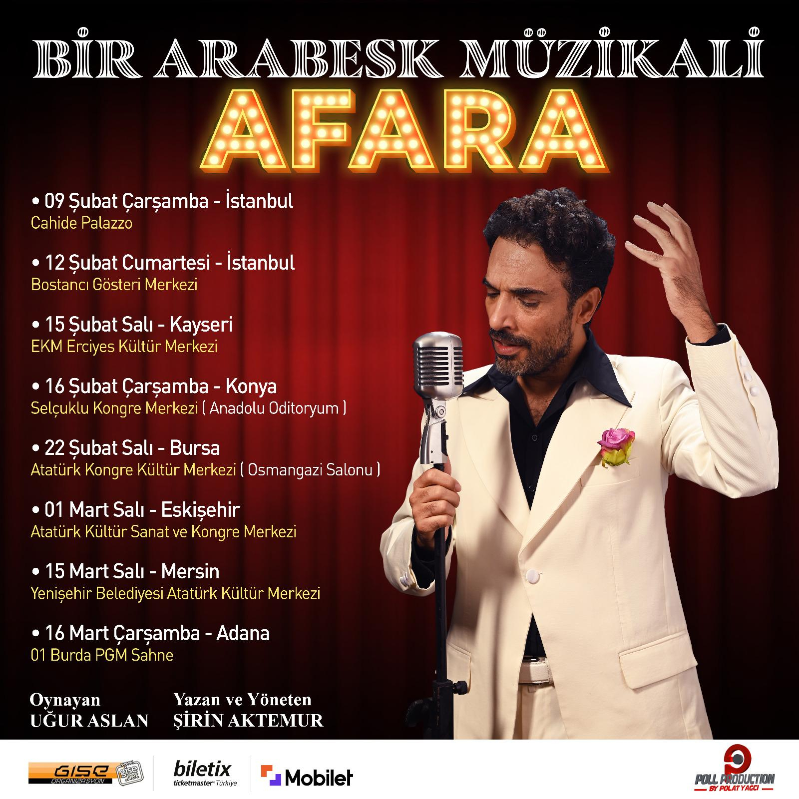 Yeni şirketi ile ilk konserine 9 Şubat’ta çıkacak olan başarılı oyuncu, yakın zamanda çıkaracağı albümünün de müjdesini verdi. Bir döneme damga vurmuş arabesk şarkıları, kendi hayat hikayesiyle birleştirerek, ‘Afara’ isimli gösterisiyle sahneye aktaran Uğur Aslan, Haziran’a kadar devam etmesi planlanan turnede Türkiye’nin hemen hemen tüm şehirlerine konuk olacak.